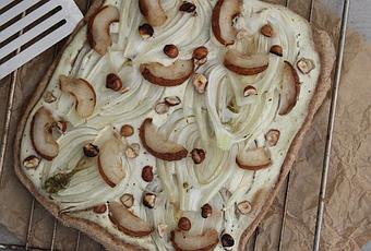 Je ne sais pas s'il en est de même pour vous, mais il est de ces ingrédients que, bien que je les apprécie, je n'ai pas le réflexe d'acheter et de cuisiner. Le fenouil en fait partie, sans que je ne puisse véritablement m'en expliquer pourquoi. Sans doute en partie parce que ce légume ne faisait pas partie du répertoire culinaire lorsque j'étais enfant, ma mère ne l'appréciant pas du tout, mais cela n'explique pas tout. En effet, il y a plein d'ingrédients qui sont aujourd'hui des incontournables de mon alimentation qui n'étaient pas au menu chez mes parents (les flocons d'avoine, le tahin, la purée d'amande et toutes les purée d'oléagineux, la noix de coco ou la sauce soja pour ne citer que les premiers qui me viennent à l'esprit). Alors pourquoi mon cerveau fait-il de la résistance avec le fenouil ? Mystère. Pourtant, moi, je l'apprécie cette fraicheur et ce petit goût anisé...mais que voulez-vous, les atavismes sont les plus forts, et bien souvent, lorsque j'en vois sur les étals, je passe mon chemin. Et les rares fois où je me décide à en mettre dans mon panier, il se languit ensuite dans mon bac à légumes, faute d'idées pour accommoder. D'ailleurs, il en va un peu de même avec la poire, mais là plus pour des raisons de goût. Si j'aime bien sa saveur douce, je la trouve parfois un peu TROP douce, et j'ai un peu de mal avec sa texture trop facilement mollassonne. Alors je ne sais pas trop d'où a jailli cette idée de pizza un peu hétérodoxe, mais toujours est-il, que cette fois-ci, je n'ai pas hésité lorsque j'ai vu les bulbes rebondis sur l'étal du maraicher. Pour rehausser un peu le côté suave du fenouil, quelques lamelles de poires, qui commencent doucement à s'imposer au rayon fruits et légumes. Les noisettes viennent apporter un peu de croquant, leur saveur délicatement torréfiée venant joliment relever les saveurs douces du fenouil et de la poire.