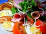 Couper les tranches de jambon et de blanc de dinde fumé en moitiés. Les enrouler et les distribuer harmonieusement sur la salade. Garnir avec quelques sommités de persil.