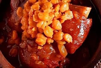 - Disposer les pieds de veau dans un plat de service, napper de la sauce et les garnir de pois chiche et de raisins secs.