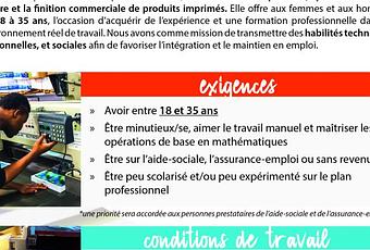 Imprime-Emploi est une entreprise d’insertion, du secteur de l’imprimerie, spécialisée dans la reliure et la finition commerciale de produits imprimés. Elle offre aux femmes et aux hommes, de 18 à 35 ans, l’occasion d’acquérir de l’expérience et une formation professionnelle dans un environnement réel de travail. Nous avons comme mission de transmettre des habilités techniques, personnelles, et sociales afin de favoriser l’intégration et le maintien en emploi.