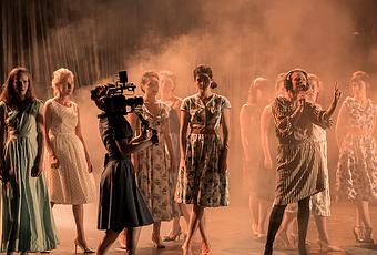 La musique, en haut des structures du décor, musique vivante, An Pierlé au piano et au chant, c’est d’abord ça, Sylvia, spectacle mis en scène par Fabrice Murgia. Mais c’est aussi neuf femmes, vêtues comme dans les années 50 en Amérique ou en Angleterre, qui tournent sur le plateau, s’avancent vers les spectateurs qui s’installent, mais sans dépasser la limite pour l’instant. Que cherchent-elles ? Elles semblent prisonnières de l’espace où elles évoluent. Et les caméras sur scène décident que ça commence. Sur l’écran en hauteur sont projetées des images du film en train de se faire, dont les séquences sont annoncées par des claps.