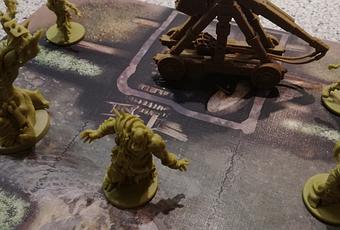Mais les créateurs ont pensé à tout. En effet, moyennant 3 actions, ce qui est énorme, un héros pourra utiliser une catapulte afin de tirer sur les hordes et essayer ainsi de diminuer les rangs! Pour cette dernière, 3 différentes actions de tir possible vont vous permettre de faire plus ou moins de dégâts! Bien pensé. Voici une amélioration de taille et qui justifie le prix de la boite de jeu vu la taille de la figurine!