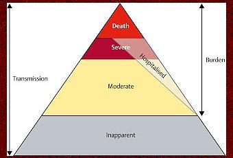 Schéma conceptuel en pyramide du fardeau des Infections des Voies Respiratoires Inférieures IVRIs imputables à la grippe.