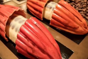Composition : Crème mousseuse infusée au riz noir, crunchy de riz soufflé, fèves de cacao torréfiées et crémeux au chocolat noir d’Indonésie 68 %. Disponible à la vente à partir du 21 décembre 2018.