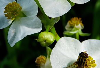 Sagittaria latifolia (Sagittaire à larges feuilles), originaire d'Amérique du Nord, cultivée pour l'ornementation des pièces d'eau et parfois subspontanée ; possède des feuilles plus larges que celles de Sagittaria sagittifolia, arrondies au sommet et des fleurs dont les pétales sont entièrement blancs. Avec Helophilus pendulus.