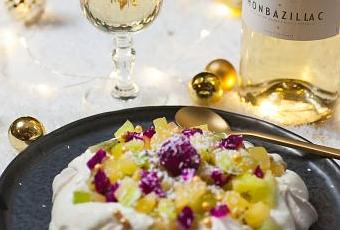 et ce dessert délicieux qu'est la Pavlova aux kiwis jaunes et verts avec ses meringues vanillées.