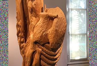 Clarisse Griffon du Bellay a pour ancêtre un rescapé du radeau de la Méduse. Quelque chose en elle rappelle le terrible instinct de vie qui pousse des gens à sans doute se battre pour subsister, voire à manger de la chair humaine, ce qui s’est produit sur le radeau. Elle sculpte le bois, lui donne apparence humaine, y inscrit des traces d’érosion, le suspend comme dans un abattoir on accroche des carcasses ou des peaux (ou comme on en montre dans certains tableaux). Ce qu’elle exhibe ainsi, ce n’est pas la mort à l’oeuvre, c’est plutôt un combat pour la vie.