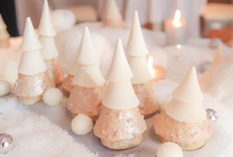 Les sapins reprennent le dessert signature 100% vanille d’Angelo Musa. Un dessert composé d’un Biscuit, d’un croustillant, d’un crémeux et d’une mousse à la vanille de Madagascar, le tout glacé au chocolat blanc,