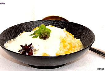 En cette veille de vacances et à quelques jours de Noël, je vous propose un dessert des plus simples à réaliser : Mango Rice Pudding .Un riz au lait, revisité par Jamie Oliver, au goût exotique et cuit dans l'eau.Le riz au lait fait partie de mes madeleines de Proust, ces desserts de l'enfance qu'on affectionne plus que d'autres.Pour le faire, j'ai testé une nouveauté Riso Gallo, Spécial Dessert. Originaire d’Italie, ce Spécial Dessert est un riz à grains ronds et petits, parfait pour les desserts, des riz au lait aux gâteaux de riz.Cuisson très facile.La mangue, surgelée en tranches, ce qui permet d'en avoir à disposition, tout le long de l'année et à tout moment, donne un très bon goût exotique au riz.Le dessert est sucré au miel mais pour une version plus light, j'ai utilisé du sucre Pure Via, 0 calorie.Le rajout du yaourt à la noix de coco apporte encore plus d'onctuosité et du goût.J'ai goûté ce dessert chaud , rajout d'un yaourt très froid.J'ai goûté ce dessert froid.J'ai préféré la version riz chaud, yaourt froid.D'autres recettes de riz au lait sur le blog : ici.D'autres recettes de Riso Gallo sur le blog : ici D'autres recettes au Pure Via sur le blog : ici. Belles vacances à tous les concerné(e)s
