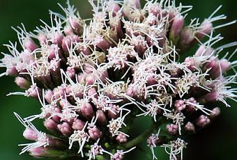 Eupatorium cannabinum (Eupatoire chanvrine) : herbacée vivace à tige dressée ramifiée et pubescente, souvent rougeâtre ; feuilles opposées à 3-5 folioles pétiolulées, lancéolées et dentées ; inflorescence terminale, dense, en corymbe ramifié de capitules composés de 3-10 fleurs tubulaires, rougeâtres.
