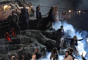 "Assez hénaurme et d'ailleurs très vraisemblable", faisait dire Jules Romains à l'un de ses personnages, et ce sont chez David Bösch aussi des hommes et des femmes ma foi pleins de bonne volonté qui peuplent un village agricole, répartis sur une toute aussi énhaurme montagne de bottes de foin dont s'échappent ici et là les fumerolles de la fermentation. On est au village que diable ! avec des gens simples, terre à terre, attachés à la glaise, les bottes de caoutchouc aux pieds, pataugeant dans le purin odoriférant qu'ils vont répandre sur leurs champs, avec des gens rudes, sans trop d'éducation mais le coeur sur la main et le bon sens bien accroché. C'est la fête au village bavarois, avec ses grandes chopes de bière, sa petite cabane à la porte percée d'un coeur qui recouvre un trou merdeux et puant dans laquelle on ne pénètre qu'en cas d'extrême urgence, et encore... On boit beaucoup jusqu'à en être malade, un homme dégueule, d'autres pissent de concert en rivalisant de jets d'urine. C'est à qui pissera le plus haut. Un tracteur circulera sur scène, ainsi qu'un cochon enrubanné tenu en laisse comme dans le Pornokratès de Félicien Rops. Le cochon répond au doux nom de Willi et semble mieux élevé que la plupart des personnages qui peuplent le village. On boit, on chique, on fume, mais oui, on partage un joint. C'est très vraisemblable, trop sans doute pour certains, mais quoi, il n'y a pas de quoi en faire un foin ! David Bösch a convié la truculence et l'hyperbole pour nous donner un grand festin visuel, il ne manque que des diffuseurs d'odeurs pour que le spectacle soit total ! Mais qui s'en plaindra ? En seconde partie, c'est l'arrivée d'un cirque qui déboule en voiture au sommet de la montagne de foin sur une rampe de transport équipée d'un tapis roulant, un cirque avec son cannibale ensanglanté heureusement encagé, avec sa danseuse sur corde étoile, jolie comme un ange, avec son homme fort, avec sa fanfare et son échassier, avec sa féerie qui rappelle les féeries de l'Elisir. Les scènes de cirque sont traitées avec un entrain et un burlesque des plus drôles. David Bösch a traité la Fiancée perdue comme un farce qui rappelle celles du moyen âge. La vulgarité crève l'écran avec une telle force qu'elle en devient drôle et s'en voit transcendée.