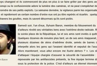 C’est Matthieu David sur twitter qui sonne l’alerte… Grâce à lui, encore une taupe facho-complotiste de débusquée parmi les gilets jaunes… ça commence à faire beaucoup. Il est franchement grand temps de nettoyer les écuries d’Augias. Celui-ci est un spécialiste de l’entrisme des mouvements sociaux. Nous l’avions déjà repéré et dénoncé parmi Nuit Debout. Il s’agit de Sylvain Baron, dont j’ai déjà parlé ici. Un sale type qui ne répugne nullement à l’apologie du terrorisme sous couvert de liberté d’expression et de lutte anti-système. La Horde en parle là. Et quand on voit de quelles amitiés il dispose, qui volent si rapidement à son secours, on est vite fixés…