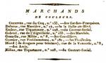Voici les premiers marchands de couleurs répertoriés à Paris. Ils n'étaient pas très nombreux, comme vous pouvez le constater. Mais il faut ajouter à cette liste, les épiciers, les apothicaires que l'on commençait à appeler des pharmaciens, qui vendaient aussi des couleurs aux artistes liste à laquelle nous pouvons ajouter les restaurateurs qui possédaient une véritable technique dans la préparation des couleurs. Dans ce premier almanach, nous nous apercevons que les rues possédand des nom avec un saint ont été raccourcies. Par exemple, la rue Saint-Honoré est devenue la rue Honoré.