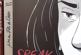 ❤ De cette histoire, j’ai tout d’abord connu la version film avec Kristen Stewart dans le rôle principal, puis le texte, publié chez « La Belle colère » sous le titre Vous parler de ça… J’ai donc été très intéressée quand j’ai su qu’une version BD allait sortir. Et je dois dire que la force du texte de Laurie Halse Anderson ne perd rien de son attrait dans cette nouvelle version, bien au contraire, je l’ai trouvée absolument magnifique. Emily Carroll a si bien su illustrer l’état d’esprit de cette jeune fille en proie au mutisme depuis une certaine soirée d’Août, son entrée difficile au Lycée, sa solitude, et ces cours d’art plastique qui sont à la fois une bouffée d’air frais pour elle et le moyen de peut-être enfin réussir à exprimer ce qui la ronge. En préface, Laurie Halse Anderson précise qu’elle a vu le roman graphique prendre de l’essor avec enthousiasme, et qu’elle a longtemps réfléchi à la façon de faire de Speak une bande dessinée, car l’expression et l’art prennent beaucoup d’importance dans l’évolution du personnage de Mélinda Sordino. Emily Caroll s’est imposée. Et c’est vrai que la forme du roman graphique est un excellent support pour cette histoire, certaines planches sont d’une grande force visuelle, accentuée par l’utilisation du noir et blanc. Il exprime le désarroi de la parole emmurée, des batailles intérieures pour la libérer et des éclaircies qui apparaissent quand elle se libère enfin. Laurie Halse Anderson a écrit Speak pour tenter d’endiguer la dépression qui la guettait suite à un viol dont elle a été victime à 13 ans. Je vous recommande chaudement cette très belle version qui peut sans problème être déposée dans des mains adolescentes.