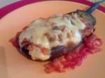 Les barquettes farcies: étalez deux cuillères à soupe de sauce + 1 cuillère d'huile d'olive sur le fond d'un plat à four, placez-y les barquettes d'aubergines. Étalez 1 ou 2 c. à soupe de sauce, maintenant sur le fond de chaque barquette d'aubergine.