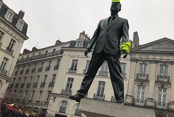 Samedi 12 janvier, jour de l’Acte IX de la révolte des gilets jaunes, il s’est trouvé quelqu’un·e à Nantes pour détourner la sculpture Éloge du pas de côté, qui trône place du Bouffay, en l’équipant d’un casque de chantier et d’un gilet de couleur jaune justement.