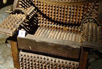 Devrais-je dire « drôle d’engin » ? J’espère quand même coller à la définition de « machine » ? Il s’agit d’un siège à pointes, instrument de torture destiné aux sorcières. La source d’énergie étant la sorcière, un opérateur étant présent pour le serrage des différents membres qui va produire le « façonnage » sur ces derniers afin d’obtenir des aveux ou des secrets bien cachés…