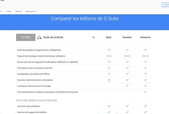 Voici dans le détail les caractéristiques d'un compte G Suite. La version offerte est la première, l'offre "Basic" :