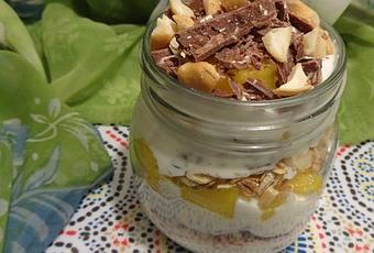 En un vaso, colocar los ingredientes en capas, terminando con el mango, el chocolate y los anacardos picados.