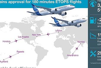 airbus-a220-canada-etopsMirabel, Québec, 14 janvier 2019 - Le nouveau membre de la famille des avions civils d'Airbus, l'A220, a reçu l'approbation ETOPS* opérations prolongées 180 minutes de la part de l'autorité canadienne de l'aviation civile, Transports Canada. Cette certification permettra aux clients de l'A220 d'ouvrir de nouvelles lignes directes sans restriction au-dessus des océans ou dans des régions peu desservies ou éloignées.
