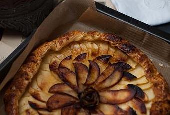 - Étalez au centre de la pâte, la gelée de rose, puis mettez les tranches de pommes de façon à ce que la pâte soit recouverte de pommes.
