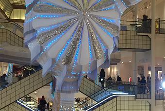 L'escalator est pris dans les tentacules de la Valkyrie que Joana Vasconcelos désigne sous le nom de Simone. Une créature double, couverte de tissus frangés blancs, parcourue de lumières.