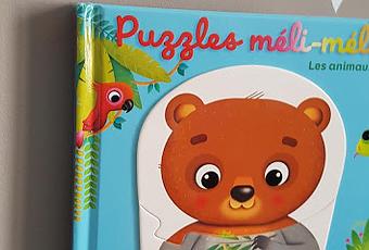Ah les puzzles méli-mélo... c'est tout un succès ici et je me souviens que c'étaient les premiers puzzles de Timothée. Dans un joli album cartonné, le tout jeune enfant va pouvoir découvrir Léon l'ourson, Sacha le koala, Gaston le lion, Agathe la suricate et José le chimpanzé dans de mignonnes et adorables aventures, souvent gourmandes. Chaque personnage a son puzzle composé de trois pièces. L'enfant va pouvoir refaire les puzzles et les mélanger pour créer et composer des personnages rigolos aux traits tendres et drôles. A gauche, une petite histoire avec des mots-image décrit l'animal, et raconte une histoire rigolote sur son mode de vie. A droite, le puzzle de l'animal en trois pièces.