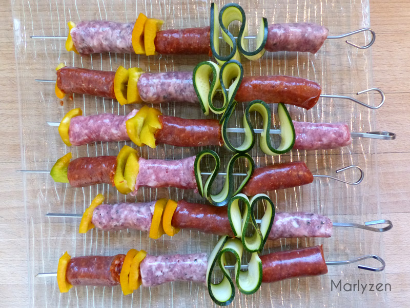 Confectionnez les brochettes en alternant chipolata, merguez, lamelles de courgette et morceaux de poivron.