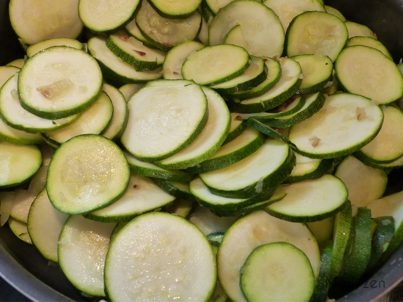 Ajoutez les courgettes, salez, poivrez et faites cuire sans couvercle afin d'évacuer l'eau.