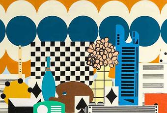 Ce qui la préoccupe, néanmoins, ce ne sont pas ces signes consuméristes, mais ceux de l’histoire de la peinture moderne, y compris dans son opposition au vernaculaire, au folklore, (le kitsch greenbergien). Or précisément avec humour et ironie Farah Atassi emprunte aux folklores des formes aux allures parfois amérindiennes, voire bavaroises, qu’elle simplifie suivant la syntaxe et le vocabulaire moderniste (Purisme, Cubisme, Rayonnisme, Primitivisme, Cubofuturisme, Constructivisme, Suprématisme, mais ce pourrait être aussi Kupka, le grand absent des citations atassiennes).