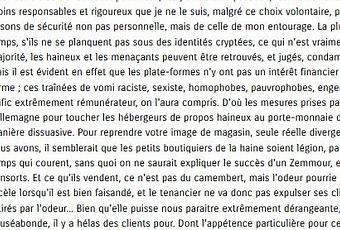 Ainsi, le sujet du RIC est symptomatique de ce que je veux dénoncer ici, la banalisation des idées floues, soi-disant non-partisanes, ni de droite ni de gauche, mais qui conduisent invariablement toujours dans la même direction, l’extrême-droite et ses idées : nationalisme, xénophobie, rejet de l’immigration, sexisme, recours à la violence envers ses opposants. Car non, Monsieur Chouard, tout ne se vaut pas, et tout n’est pas égal à tout, et il y a bien une ligne rouge qui délimite la liberté d’expression, qui est celle de ne pas nuire à l’Autre. Pas de libertés pour les ennemis de nos libertés fondamentales, comme le sont les (si peu néos) nazis, les racistes, les antisémites, les islamophobes, les xénophobes, les homo et transphobes, les sexistes, les machistes, les virilistes à deux balles, bref tous ces haters (pourtant une minorité, mais atrocement agissante) qui se croient autorisés à nous balancer les pires horreurs sur le net, alors que la solution à ce phénomène serait pourtant si simple… Mais n’assiste-on pas, vis à vis de la généralisation des propos haineux sur internet, à une formidable hypocrisie publique ? (voir ici... et comme l’admin du blog a du effacer malencontreusement mon commentaire, je le reposte ici :