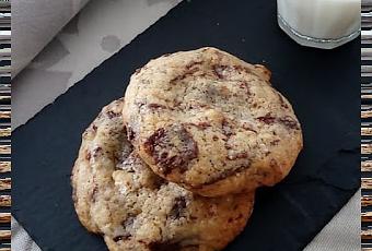 Pour 12 pièces : 210 g de farine, 1½ cc de fécule de maïs, 1 cc de bicarbonate de soude, 1 pincée de sel, 180 g de beurre fondu, 135 g de sucre vergeoise blond, 70 g de sucre blanc, 1 œuf entier + 1 jaune, 2 cc d'extrait de vanille en poudre, 55 g de poudre de noisettes, 75 g de noisettes, concassées, 150 g de chocolat noir haché grossièrement