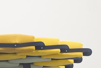 « Cette banquette propose un concept d’assise qui positionne le corps accueilli au sein d’un léger « pli ». Constitué d’une maille d’aluminium déployé de 5mm d’épaisseur, un produit développé exclusivement pour cette application par l’entreprise Métal Déployé, cette banquette utilise sa structure pour son inclinaison naturelle, et pour ses vides. Ils permettent de positionner les coussins en leur sein, ce qui offre des surfaces confortables au potentiel graphique important, sur la base de « pixels ». ? Plus qu’une banquette, c’est un principe qui peut se déployer dans l’espace de manière linéaire, pour créer des ensembles à l’échelle architecturale, liant l’espace et le corps, à la façon d’une d’agora tapissée »