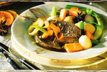 Remettez tous les légumes quelques minutes dans le bouillon pour les réchauffer, puis dressez les quatre morceaux de filet dans des assiettes creuses préchauffées. Ajoutez les légumes, nappez d’un peu de bouillon aux épices et, au dernier moment, assaisonnez de sel de Guérande.