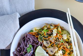 Wok de légumes et nouilles de riz noir à l'asiatique, sauce au sésame