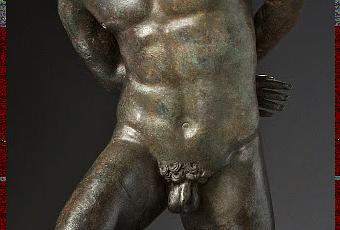 Statue de captif - 4e quart du Ier siècle av. J.C.Bronze - Dimensions : H. 63,3 ; L. 28 ; Pr. 44,5 cm. Poids 18,96kgMusée départemental Arles antique - Dépôt du DRASSM - Inv. RHO.2007.06.1962 - © MDAA, Jean-Luc Maby Cette statue d’un homme nu à genoux, les mains entravées dans le dos, est d’une exécution exceptionnelle. Barbu et moustachu, certains y voient un Gaulois. Il faisait partie d’un groupe (perdu) auquel il a été arraché.L’œuvre, qui représente vraisemblablement un barbare vaincu, devait appartenir à un monument public d’Arles conçu pour célébrer le triomphe de Rome. Il pouvait s’agir d’une commémoration de la conquête des Gaules par César, ou d’un symbole plus général du pouvoir romain. À la finesse d’exécution et à la dimension de la ronde bosse, on reconnaît le travail d’un atelier confirmé qui s’est inspiré d’un modèle hellénistique.On peut imaginer ce à quoi devait ressembler le groupe statuaire d'après les représentations connues sur des monnaies romaines dès le milieu du Ier siècle av. J.-C. Le captif se tenait probablement à gauche, tourné vers un trophée se présentant sous la forme d’un mât auquel sont suspendues les armes des vaincus. À droite pouvait se trouver un autre captif, homme ou femme.Il s’agit de l’une des plus anciennes représentations sculptées d’un captif nu en bronze appartenant à un trophée. On ignore comment il a pu se retrouver au fond du Rhône, d’où il a été tiré en 2007, mais ce sont les conditions particulières qu’offre ce milieu qui ont permis son exceptionnelle conservation.