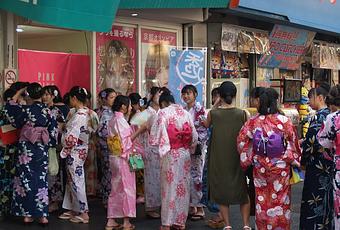 Nous avons été très surpris, au Japon, de nous rendre compte que le kimono se porte encore et qu'il se porte dans la rue. Il est porté aussi bien par les hommes que les femmes, en particulier le soir lors des festivités.