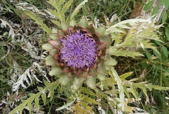 Il y a plusieurs années j'avais des plants d'artichauts dans mon jardin, donnés par un viticulteur. Un jour, voyant que des pucerons nombreux étaient cachés à l'intérieur des feuilles, j'ai laissé sur place un artichaut. Il a fleuri :