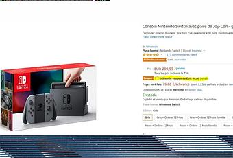 Amazon propose actuellement la Switch à 299.99€ voire 298.99€ en livraison lente pour les primes. Mais il est possible d'y ajouter un coupon de 40€ ce qui fait passer le prix de la Switch à 299.99€ voire 298.99€.
