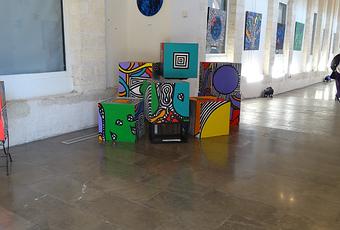 Vasarely, Picasso, l'art africain, on n'est loin de rien et pourtant on est là, en plein dans ce travail " ludique ". Des cubes et des mikados, des boules qui feront pchitt, des invitations à aller y voir. Mer de Chine, Caméléon, Jaune soleil, Jour de pêche, Illusion d'optique, Alertez les bébés, Fulgurance... ne demandent qu'un chose : être vues !