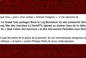 Résumons. Voilà donc un type qui relaie une caricature antisémite mais ne voit pas où est le problème. Qui donne des interviews à une chaîne d’extrême-droite qui a reçu le nazi Ayoub, mais ne voit pas où est le problème. Qui propage un multi-récidiviste de la haine raciste, l’antisémite et suprémaciste blanc Boris Le Lay et son site bien ordurier si mal nommé Démocratie Participative, lui aussi antisémite, mais ne voit toujours pas où est le problème. Qui devise volontiers avec Gaccio, dieudonniste invétéré, de dossiers aussi peu chargés et périlleux en la matière que celui de la Palestine, mais ne voit encore et toujours aucun point commun ni aucune raison de s’émouvoir… Sans parler de Russia Today, dont on sait ce que j’en pense ici…