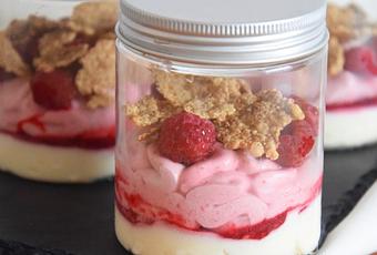 - Verser un peu de la préparation framboise dans le fond des pots (une fine couche de gelée)