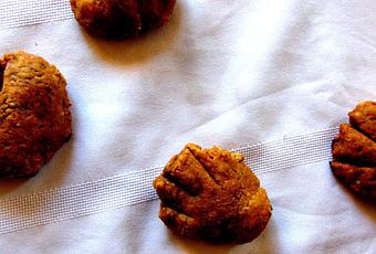 On façonne des bouboules de la grosseur d'une balle de golf (ou un peu plus petites si on préfère des petits biscuits), on les écrase, on fait des entailles pour leur donner un look de pattes d'ours (ou pas!) et on les enfourne à 375 pendant 15-30 minutes.