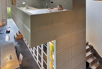 Sur l’agencement spatial de l’espace, nous sommes confrontés à un superbe jeu d’équilibre qui s’apparente presque à une sculpture. L’étage semble se déployer d’une base fine pour se déployer dans les airs. Les espaces de vie de la maison sont suspendus dans l’air d’une manière presque vertigineuse en témoigne la baignoire très originale (mais laquelle nous serions peu rassurés, avouons le).