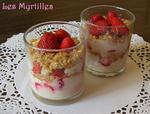 ou 4 fraises suivant leur grosseur, puis encore une couche de crème, ajouter le mélange cacahouètes-flocons d'avoine, et recommencer les mêmes couches pour finir avec les 3 ou 4 fraises sur le dessus de la verrine.