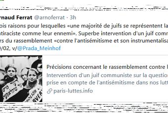 Le climat et les incidents qui ont entouré nos prises de parole relèvent autant de la crétinerie que de la haine viscérale des juif-ves. Le plus étonnant a été la non-réaction absolue des organisateurs. En tant que juif engagé dans les luttes sociales, il a été très difficile d'accéder à la parole. Cette même gauche antiraciste ne prétend-elle pas valoriser la parole et l'auto-organisation "des premiers/premières concerné-es"? Les communiqués faisant suite à ce rassemblement font état d'un succès total, je lis même que Ménilmontant serait "la capitale de l'antiracisme". Lutte-t-on contre le racisme en se contentant d'énoncer ses désirs?