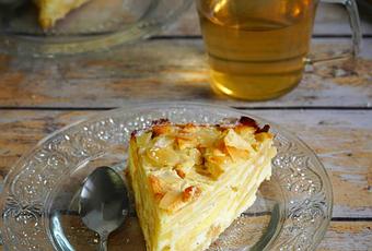 Ce gâteau est entre un clafoutis , un flan , tout en douceur grâce à la ricotta ( très présente en goût ) , je suis fan de ce genre de dessert léger , frais aux fruits qui se mange au goûter ou en dessert ou même au petit déjeuner . Il n'est pas très sucré . Il est réalisé avec des pommes golden mais j'aurais pu aussi mettre des poires . Par rapport à la recette de Carole , j'ai ajouté un peu de raisins secs , 1 cuil à soupe d'alcool pour le parfumer et un peu d'extrait de vanille et j'allais oublier quelques amandes effilées et du coup je n'ai pas mis de zeste de citron .