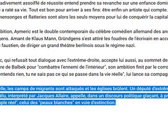 Le spectacle dont je viens de voir l'une des critiques m'apparait de cette nature. Quelques extraits me parlent directement de cette vision antifasciste que nous devrions tous avoir... si nous étions réellement, TOUS, soucieux de préservation de la démocratie réelle, plutôt que de nous mettre pour beaucoup trop d'entre nous la tête sous le sable pour ne pas avoir à affronter trop frontalement certains démons dans notre société pourrissante... Et à assumer notre prise de conscience, dont les effets concrets peuvent être parfois très violents, surtout sur le plan professionnel, mais aussi personnel. L'article évoque très bien tout cela, au oint qu'il soit difficile d'en désolidariser les passages...