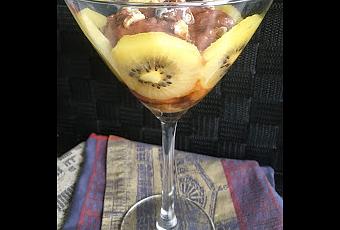 Ils seront disposés au fond d'un verre dont les parois accueilleront de fines rondelles de kiwi jaune (il est plus doux que son frère vert). J'ai ensuite rempli avec la mousse et décoré de petits éclats de marron confit autour d'un plus gros, central, qui annonce bien entendu le parfum de la liqueur de chataigne.