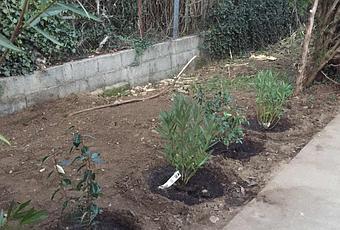 Weekend d'élagage d'oliviers et d'arbres hauts (j'ai plus peur de monter sur mon échelle de trois mètres). Et après avoir arraché des arbres morts à la force de mes bras, j'en plante d'autres.